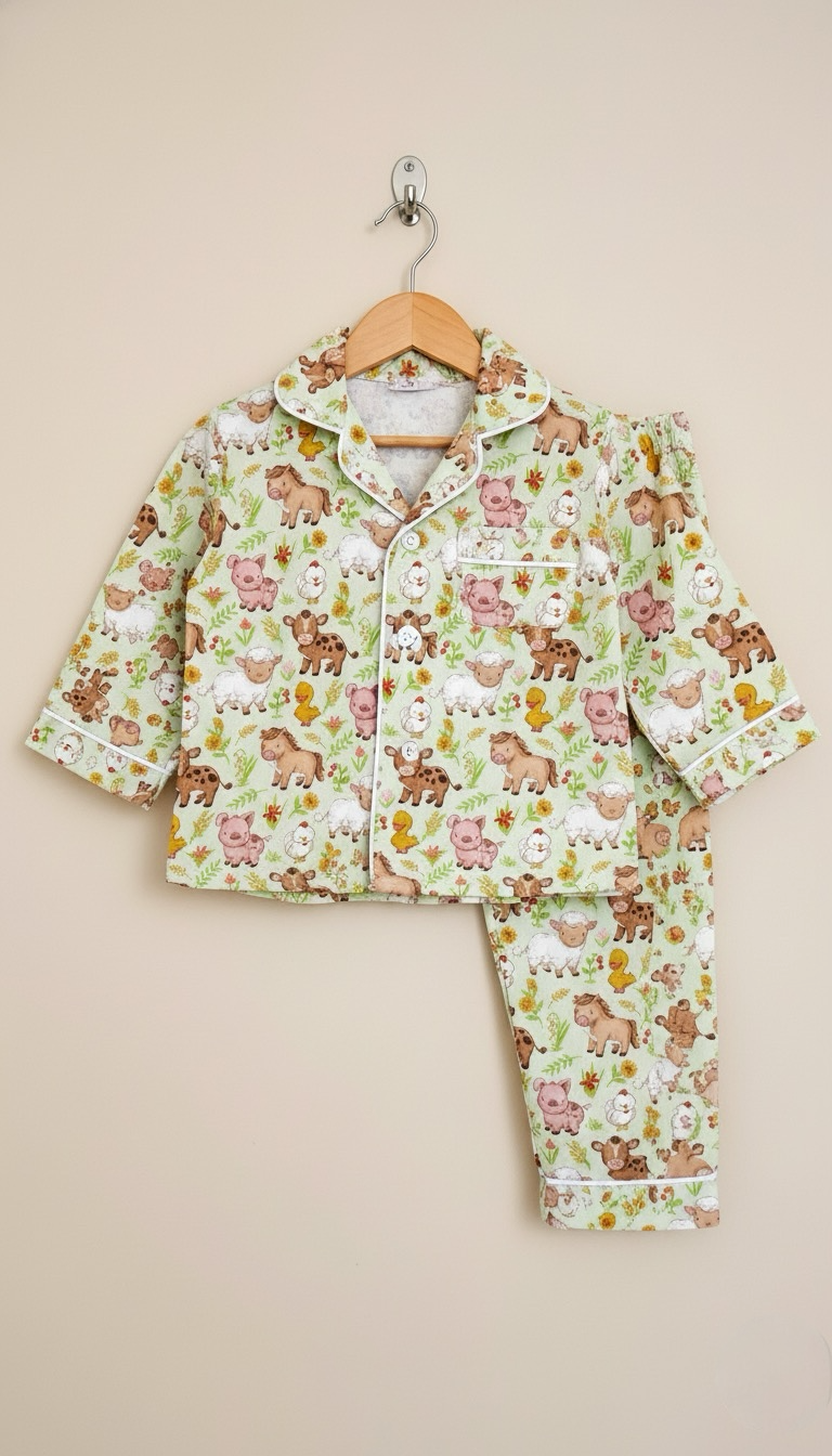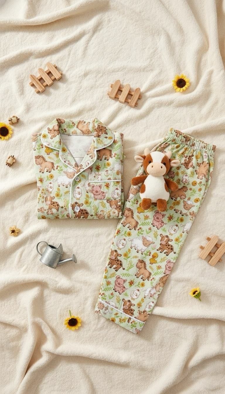 A charming, light green pajama set featuring a delightful farm animal print amidst sunflowers and foliage. The set includes a button-up top with white piping and matching full-length bottoms, accompanied by a small cow plush toy.