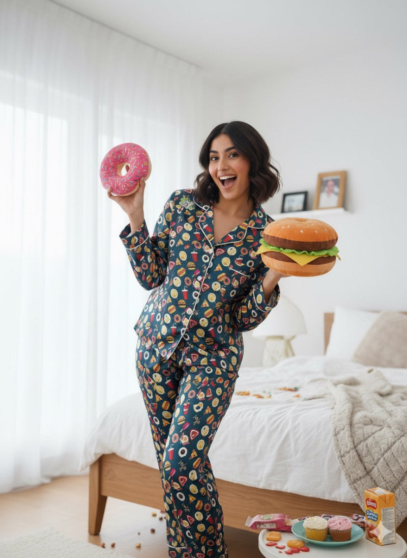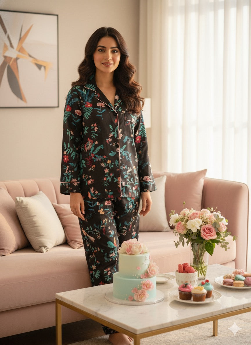Silk round collared shirt with front open and matching printed trouser.