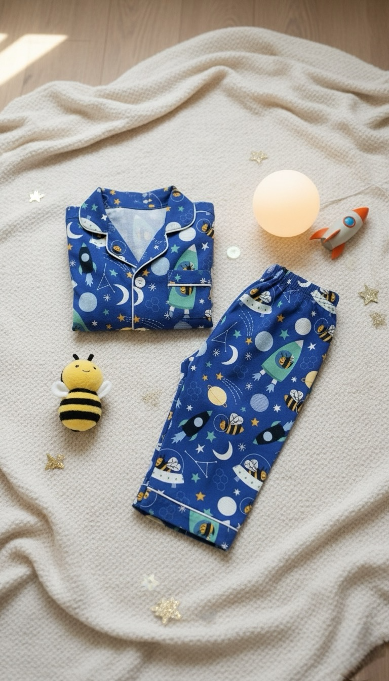 These charming flannel pajamas feature a playful, deep blue print of bees flying in spaceships among stars, moons, and planets.