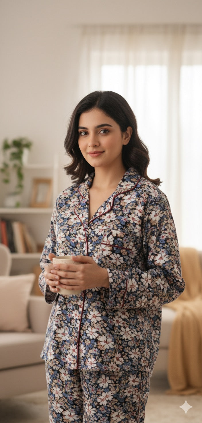 Introducing Tibet, the perfect addition to your wardrobe. Made from high-quality marina, this set features a printed notched collared shirt and matching trousers in a stunning pink colour with a delicate floral print and vibrant red details. Stay stylish and comfortable with Tibet.
